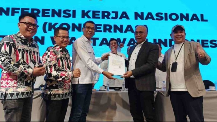 Ketua PWI Lampung, Wirahadikusumah, menyerahkan dokumen kesediaan Gubernur secara langsung dalam forum Konferensi Kerja Nasional (Konkernas) di Hotel Aston, Banten, Sabtu (7/2/2026). Momentum serah terima berkas tersebut mendapat sambutan luar biasa dari seluruh fungsionaris organisasi yang memadati ruang pertemuan.