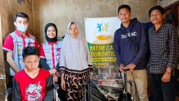 Senyum bahagia terlihat dari wajah Hendrawan (13) warga Desa Otak Rarangan, Kecamatan Wanasaba, Kabupaten Lombok Timur. Ketika menerima bantuan unit kursi roda dari Yatim Care Foundation (YCF) kolaborasi Metro Bangunan.